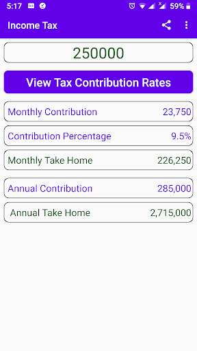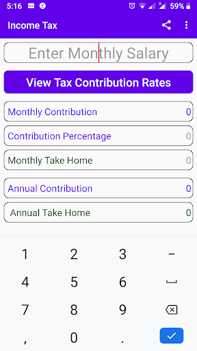 By using this app, you can easily calculate Monthly Tax Contribution, Contribution Percentage, Monthly Take Home Amount, Annual Contribution and Annual Take Home Amounts based on the income tax laws of Pakistan.